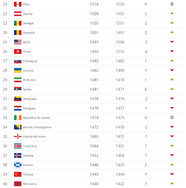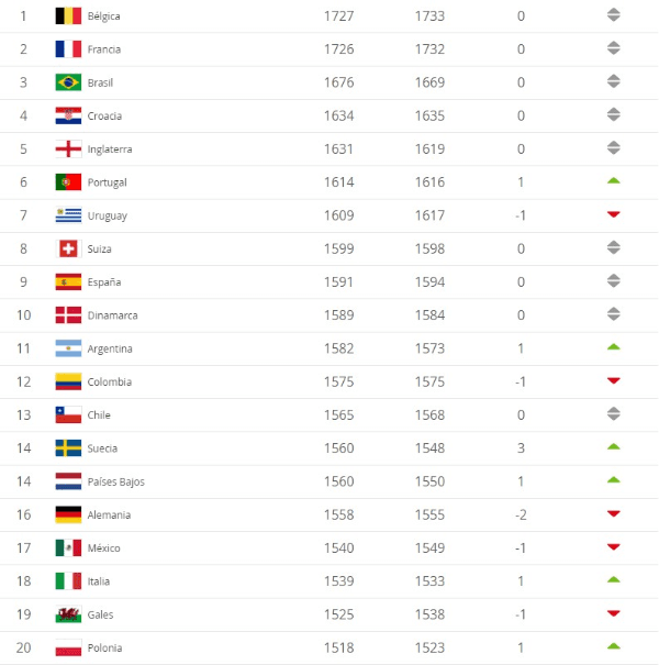 Allí, Portugal intercambió lugares con Uruguay. Argentina, por su parte, hizo lo propio con Colombia. Llama la atención ver a Alemania, que en esta oportunidad bajó dos puestos más y se ubica en la décimosexta posición.