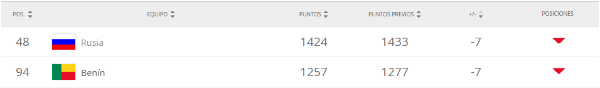 En esta oportunidad, sorpresivamente, hay dos selecciones que ocupan el puesto en el que nadie quiere estar: Rusia, que hace poco fue hogar el Mundial, y Benín cayeron siete ubicaciones cada una.