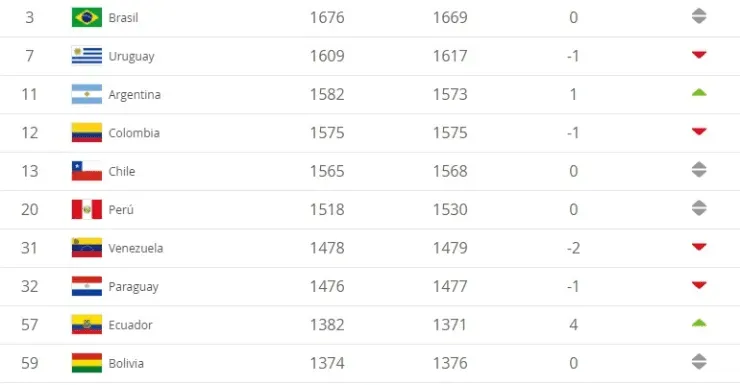 Ya en la sección de Conmebol, el ascenso más marcado y destacable es el de Ecuador, selección que subió cuatro puestos. El resto de los seleccionados no sufrieron muchos cambios abruptos.