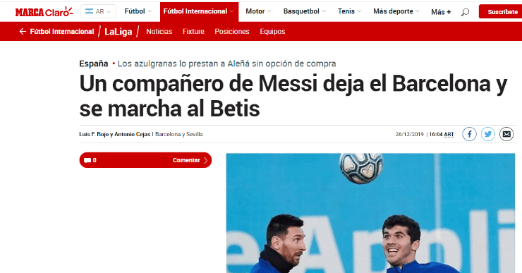 El portal en cuestión informó que, a falta de confirmación oficial, el cuadro Culé habría llegado a un acuerdo para concretar la cesión deCarles Aleñá.