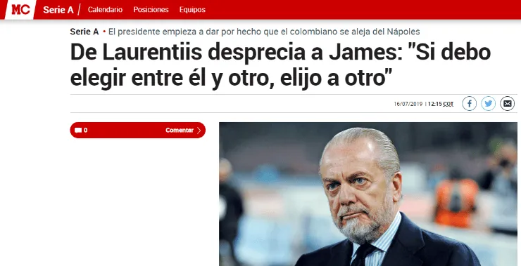 Marcando las ventajas del tipo de transferencia que pide el Napoli, el presidente explicó: “Si Jamespudiese llegar cedido sería perfecto, porque así tendríamos dinero para fichar a otro jugador”.