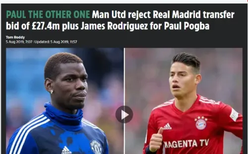 Este lunes, el diario The Sun,. aseguró que, nuevamente, los diablos rojos rechazaron una oferta en la cual, el Real Madrid cedía a James Rodríguez y más 30 millones de euros para llevarse a Pogba, la cual habría sido rechazada.