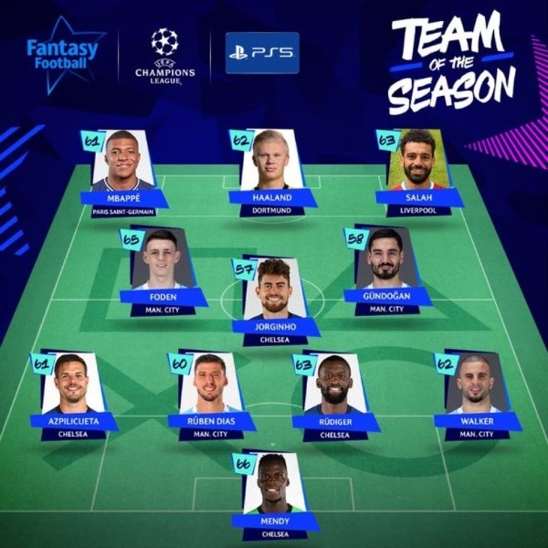 El once ideal de la Champions League 2020/2021:Edouard Mendy (Chelsea); Kyle Walker (Manchester City), Antonio Rüdiger (Chelsea), Rúben Dias (Manchester City), César Azpilicueta (Chelsea); Ilkay Gündogan (Manchester City), Jorginho (Chelsea), Phil Foden (Manchester City); Mohamed Salah (Liverpool), Erling Haaland (Borussia Dortmund) y Kylian Mbappé (Paris Saint-Germain).