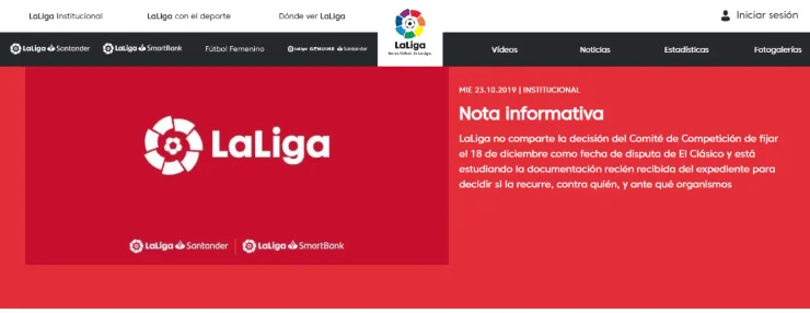 “LaLiga no comparte la resolución del Comité de Competición de fijar el 18 de diciembre –siguiendo el acuerdo alcanzado por el FC Barcelona y el Real Madrid, pese a la negativa de LaLiga- como fecha de disputa del Clásico anteriormente aplazado, si bien está estudiando la documentación recién recibida del expediente referente a este procedimiento para valorar las posibles acciones legales a entablar, contra las instituciones que corresponda y ante los organismos públicos u órganos jurisdiccionales que estime oportuno.