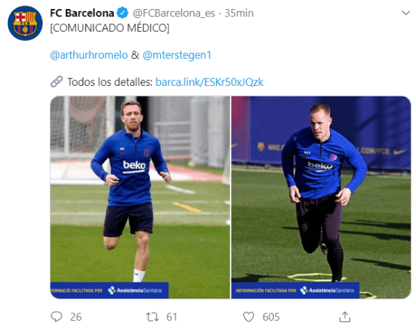 Según comunicó en sus redes sociales el club a través de un informe médico, tanto el brasileño Arthur, quien sí se quedó entrenando con el club, como el portero alemán Marc Adré Ter Stegen han sido bajas por lesión.