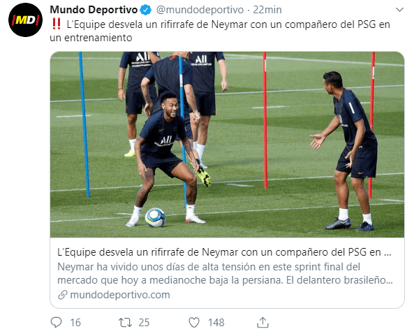 Al parecer, Neymar tuvo un enfrentamiento con un compañero durante un entrenamiento que tuvo lugar cuando este ya sabía que no iría al Barcelona.