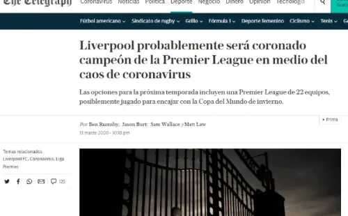Según informó The Telegraph, analizan suspenderla y que Liverpool sea nombrado como el campeón. Además, se suspenderían los descensos y ascenderían los dos equipos que están primeros en la Championship: West Bromwich y el Leeds de Marcelo Bielsa.