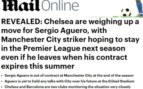 Según el medio británicoDaily Mail,Agüero estaría en los planes del Chelsea en el caso de que quede libre a partir del 30 de junio. Los Blues serían la solución para el Kun para cumplir su deseo de quedarse en Inglaterra jugando la Premier League.