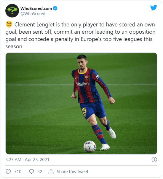 Hablando de equivocaciones, en el último triunfo, uno de los jugadores alcanzó el registro que ninguno de sus colegas desearía ostentar. Con el autogolayer, se conoció que Clément Lenglet es el único futbolistasde las cinco grandes ligas europeas en obtener un póker de desgracias defensivas.