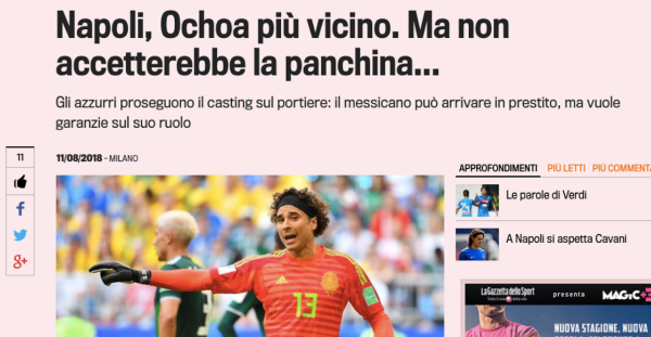 Según la Gazzetta dello Sport, el viernes podría sellarse el acuerdo entre los clubes y le permitiría al mexicano sumarse al Napoli para jugar la fase de grupos. Según el mencionado medio, el único temor del mexicano es que quieran dejar a Meret como titular una vez se encuentre disponible.