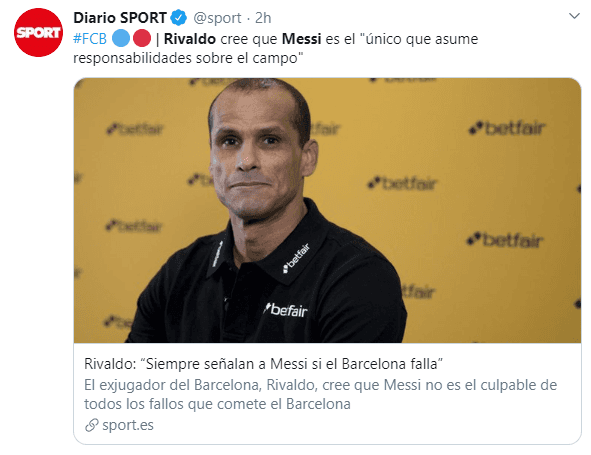“El problema es que ahora Leo es el único jugador capaz de asumir ciertas responsabilidades individuales.El único que intenta desequilibrar en ataque, que lo intenta desde fuera del área, que regatea. Y no parece que haya nadie que sea capaz de ayudarle en esa tarea”, insistió Rivaldo.