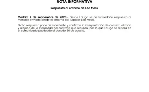 Ahora, quien no tardó en responder y poner el grito en el cielo fue la Liga Española. Publicando una breve pero contundente réplica, la casa madre del fútbol español, haciéndose eco del comunicado emitido por parte del astro argentino, definió una vez más su postura y exteriorizó que se mantiene firme junto a la notificación emitida hace unas pocas semanas.