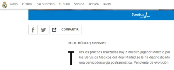 Informando que el retorno a las canchas del hombre de Brasil se encuentra “pendiente de la evolución” de su lesión, el club lanzó: “Tras las pruebas realizadas hoy a nuestro jugador Marcelo por los Servicios Médicos del Real Madrid se le ha diagnosticado una cervicodorsalgia postraumática”.