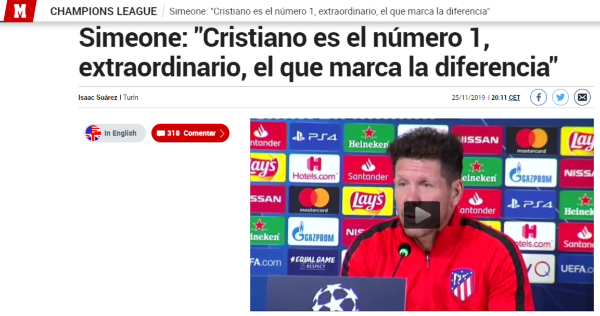 Al ser consultado por el astro portugués, el Cholo fue directo: “Es el número uno, extraordinarioy que siempre hace la diferencia. Igual, no creo que se hable de Ronaldo contra el Atlético, venimos a jugar contra la Juve”.