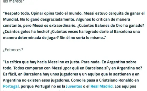 “La crítica que hay hacia Messi no es justa. Para nada. En Argentina sobre todo. Todos comparan con Messi ¿por qué en Barcelona sí y en Argentina no? Es fácil, en Barcelona hay unos jugadores y un equipo que lo sostienen y en Argentina no existen esos jugadores. Como le pasaa Cristsiano Ronaldo enPortugal, porque Portugal no es laJuventuso elReal Madrid. Los equipos fortalecen al gran jugador, es fácil”, cerró.