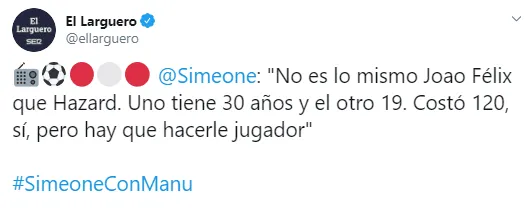 Comparando las transferencias del cuadro Merengue con la del Colchonero, el Cholo, en diálogo con El Larguero, sentenció: “Puedes hacer un Real Madrid oBarcelonaa base de talonario como lo empezamos a hacer nosotros de a poquito. Con uno de 120 millones, que no es Hazard que tiene 30 años. Es uno de 19 años que hay que hacerlo. No es lo mismo”.