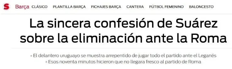 Según detalló Sport, Luis Suárez, recordando dicho acontecimiento, se mostró muy arrepentido por algo en particular. Es que el artillero uruguayo había jugado días antes los 90 minutos ante el Leganés por La Liga, por lo que no llegó al 100% para el compromiso por Champions.