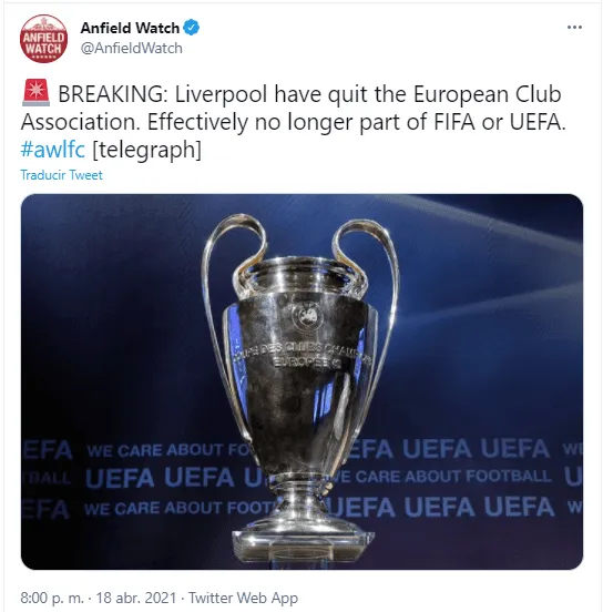 Liverpool, campeón de la UEFA Champions League 2018-19, se habría retirado de laEuropean Club Association,órgano al que pertenecía desde hacía más de 10 años. Esto llevaría a que losRedsdejen de ser parte tanto de la UEFA como de la FIFA, una decisión que ha shockeado a todo el Reino Unido y el mundo del fútbol en general.