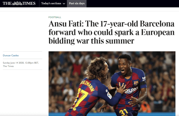 El conjunto inglés le hizo una oferta al Barcelona por Ansu Fati la cual rondó los 150 millones de euros, según informó The Times.