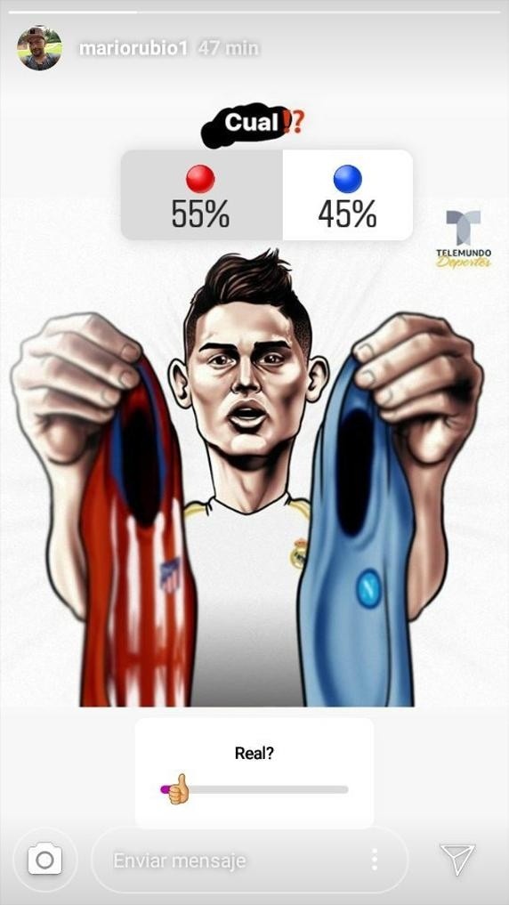 Por ello se han generado varios rumores y, ahora, su propia familia hace parte de la polémica. Uno de los tíos del jugador, Marios Rubio, quienes muy activo en las redes sociales, hizo una encuesta en Instagram en la cual le preguntó a los usuarios si prefería ver a James en el Atlético de Madrid, en el Nápoles o que se quedara en el Real.