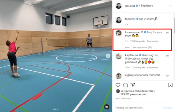 Aunque el alemán recibió una catarata de mensajes positivos para ambos, quien dejó un mensaje más que particular fue Lucas Vázquez. El compañero de Kroos, desatando una lluvia de risas en el posteo de Toni, escribió: “Muy fácil para tu madre”.