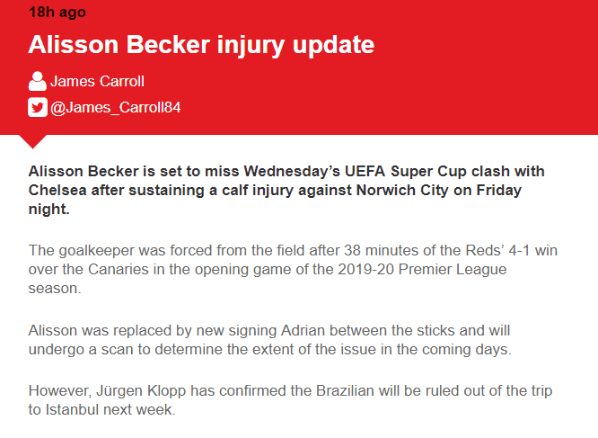 Alisson había abandonado el encuentro lesionado y el entrenador Jürgen Klopp confirmado que no disputaría la Supercopa ante Chelsea este miércoles.