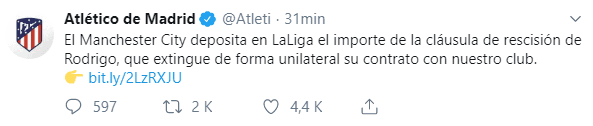“LaLiga ha comunicado este miércoles al Atlético de Madrid que Rodrigo Hernández, representado por un apoderado, y representantes del Manchester City han comparecido en la sede del organismo futbolístico con el fin de ejercer la cláusula de rescisión del futbolista.