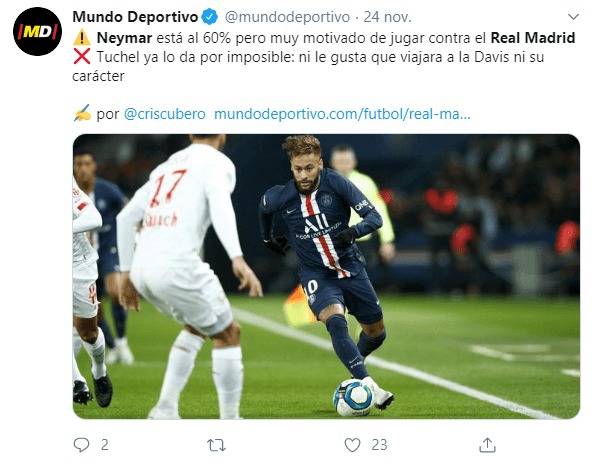 El brasileño, que está dejando atrás una nueva lesión y que jugó 65 minutos el pasado viernes ante Lillie por la Ligue 1, no está confirmado comi titular para la visita de PSG al Real Madrid en el Bernabéu, por Champions League.