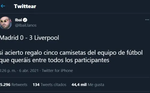 Pero eso no fue todo: al mismo tiempo, Ibai Llanos prometió que, si acierta con su pronóstico, regalará cinco camisetas de cualquier equipo de fútbol entre todos los participantes.“Madrid 0 – 3 Liverpool. Si acierto regalo cinco camisetas del equipo de fútbol que querais entre todos los participantes”, publicó en su cuenta de Twitter.