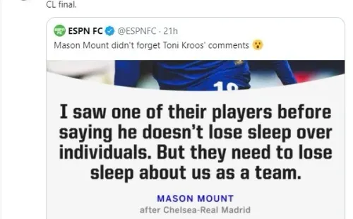 Ganador de las ediciones de 2013, 2016, 2017 y 2018, Toni Kroos salió rápido a responder a un Mount que el próximo 29 de mayo buscará su primera Champions. Por medio de cuenta Twitter, el jugador del Real Madrid devolvió el golpe: “Sigo durmiendo bien. Pero bien hecho ayer. felicitaciones. Buena suerte en tu primera final de Champions League”.