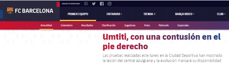 Las pruebas realizadas este lunes al jugador del primer equipo, Samuel Umtiti, han mostrado que tiene una contusión en el pie derecho. La evolución marcará su disponibilidad.