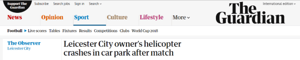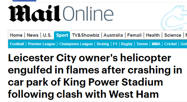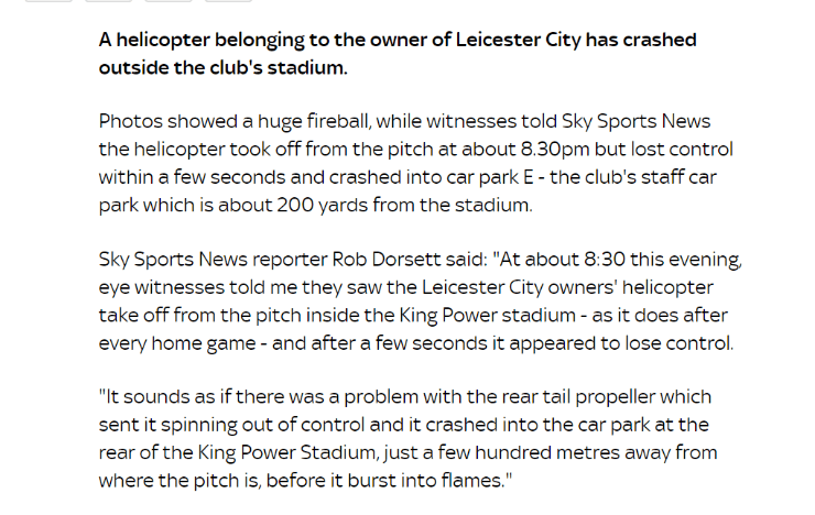 Al finalizar el partido entre Leicester y West Ham, un helicóptero se estrelló a metros del King Power Stadium, incendiándose y provocando el temor en toda la ciudad.