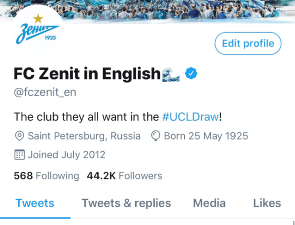 Se trata del Zenit ruso, que en su cuenta de Twitter ahora se presenta como “el club que todos quieren en el sorteo de la Champions League”.
