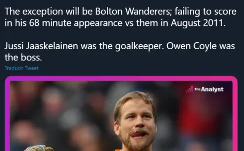 Y los datos siguen asombrando. Por sobre todas las cosas hay uno que no deja de llamar la atención y tiene que ver con que Agüero les marcó a 32 de los 33 equipos que enfrentó bajo la órbita de la Premier League de Inglaterra. El único equipo al que no le pudo anotar es Bolton Wanderers, contra quien jugó 68 minutos en agosto de 2011. Demencial.