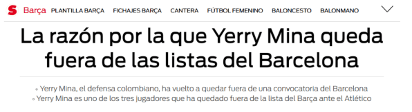 Yerry Mina se quedó afuera de la lista de concentrados para el duelo del domingo entre Barcelona y Atlético Madrid en el Camp Nou.