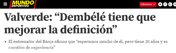 Además, aseguró: “Dembélé siempre se enfrenta al rival, es un regateador, tiene potencia, juega por dentro, al espacio, maneja las dos piernas, puede jugar por las dos bandas… Es cierto que en determinados momentos tiene que mejorar la definición final, pero tiene 20 años y con tiempo lo irá haciendo, es cuestión de experiencia”.