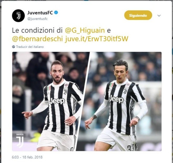 “Durante el Derby contra el Torino, Higuaín sufrió un trauma contusivo-distorsionador en su tobillo izquierdo. Se planean pruebas adicionales en los próximos días”, asegura el comunicado.