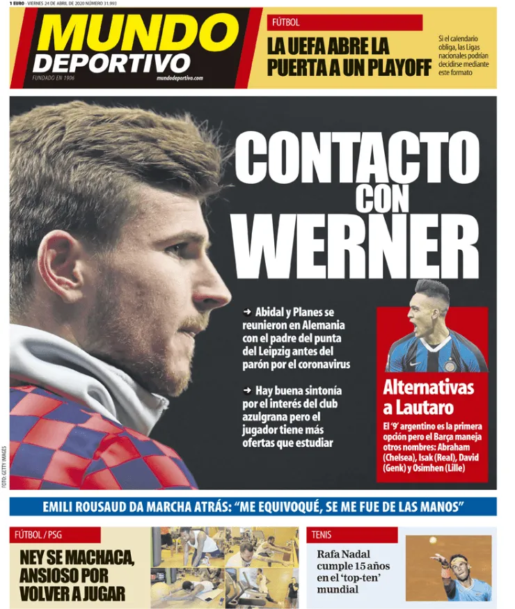 En la portada de este viernes,Mundo Deportivotituló: “Contacto con Werner“. Aseguran que Éric Abidal, secretario técnico deportivo del Barcelona, yRamon Planes, adjunto secretario técnico del primer equipo, se reunieron con el padre deTimo Werner, la gran estrella alemana del RB Leipzig. Es una de las figuras de la Bundesliga y además marcha quinco en la lucha por la Bota de Oro con 21 goles en lo que va de la temporada 2019/20.