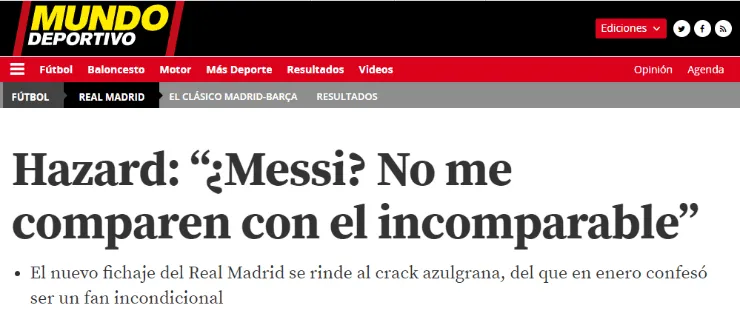 Según detalló Mundo Deportivo, al ser consultado por una posible comparación entre él y el argentino, Hazard deslizó que simplemente“es imposible”.