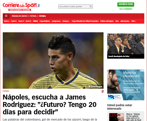 Sin embargo, medios italianos afirman que ya hay una fecha establecida para que James Rodríguez arribe a la ciudad de Nápoles.’Corriere dello Sport’ aseguró que el cucuteño estaría llegando al club el próximo 20 de julio.