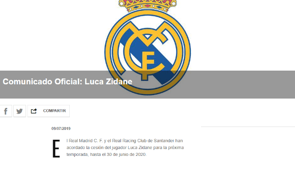 “El Real Madrid C. F. y el Real Racing Club de Santander han acordado la cesión del jugador Luca Zidane para la próxima temporada, hasta el 30 de junio de 2020”, comunicó el club desde su sitio web y redes sociales oficiales.