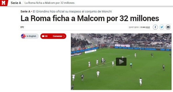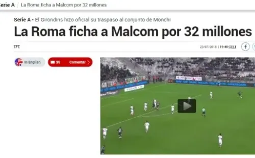 Este lunes, el conjunto italiano prácticamente se aseguró los servicios de Malcom, un joven extremo brasileño que viene de deslumbrar partido tras partido con la camiseta del Girondins de Burdeos francés.
