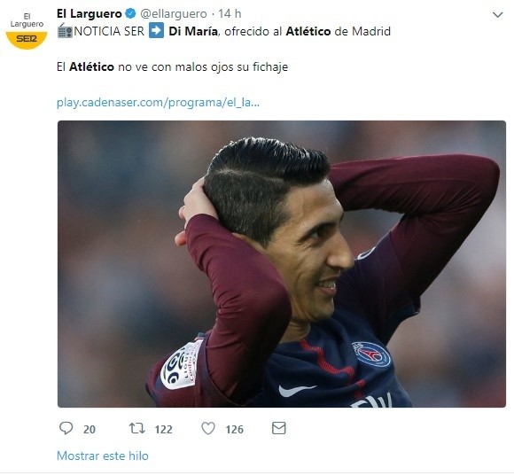 Es que según informó laCadena SER, el argentino Ángel Di María ya se habría ofrecido para arribar al equipo Colchonero, movimiento al que no pondrían mayor oposición desde París teniendo en cuenta que el contrato del futbolista finaliza el año próximo.