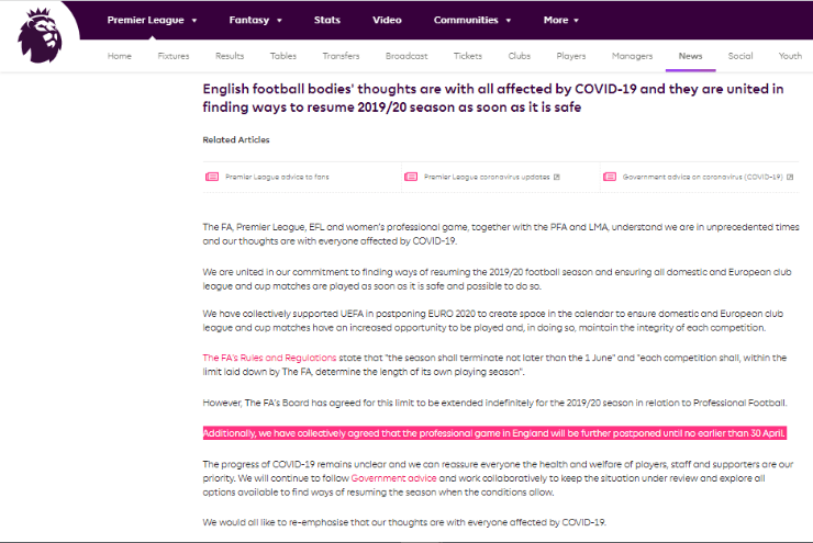 Luego de detallar algunas cuestiones vinculadas al compromiso de laAsociación Inglesa de Fútbol en torno al control y cuidado de las personas vinculadas al ente y el deporte en cuestión, el comunicado manifestó:“Adicionalmente, hemos decidido de forma colectiva que el fútbol profesional en Inglaterra será pospuesto hasta no antes que el 30 de abril“.