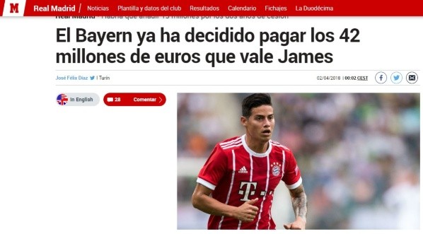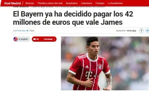 Esa es la suma que ambos clubes acordaron al momento de la llegada de James Rodríguez a Bayern Munich. Cabe destacar que los alemanes ya abonaron 13 millones de euros en concepto de la cesión de la presente temporada.