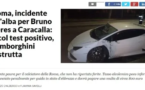 Bruno Peres vivió un episodio que pudo terminar en tragedia cuando alrededor de las 5 de la madrugada se estrelló con su Lamborghinien Termas de Caracalla, una calle céntrica ubicada a menos de un kilómetro del Coliseo.