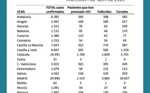 Madrid se mantiene como la región de España más afectada por la epidemia, con poco más del 40 por cientode los casos, aunquela enfermedad va en aumento en Catalunya, que ya tiene más pacientes en cuidados intensivos que la región capitalina.Los casi 47 millones de españoles se mantienen confinados desde el 14 de marzo y el gobierno ordenó desde el lunes pasado la paralización durante dos semanas de todas las actividades económicas “no esenciales”, para frenar los contagios y evitar saturar los hospitales.