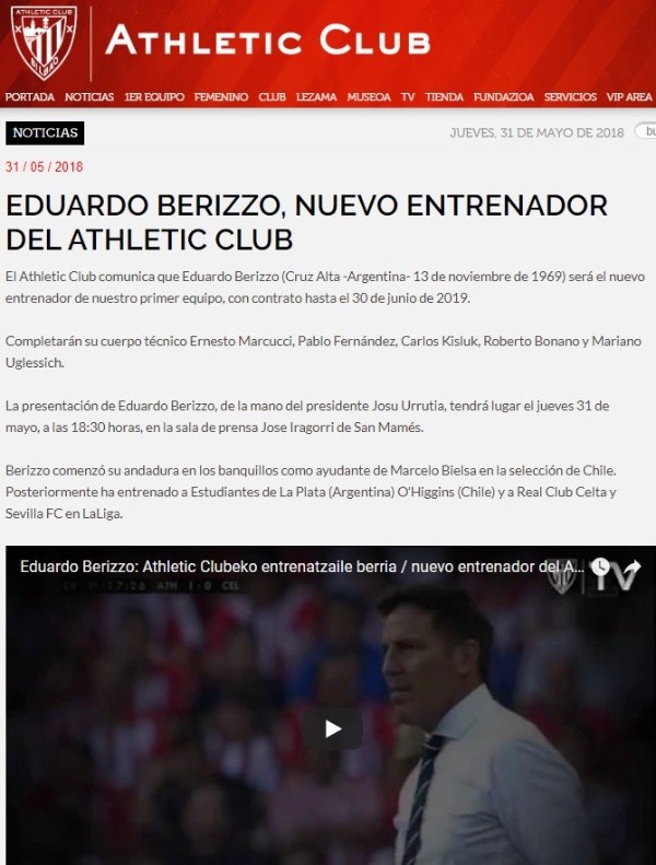 AthleticBilbao ha hecho oficial la contratación de Eduardo Berizzoen un comunicado en sus medios oficiales. Totohabía sido ayudante de Marcelo Bielsa, muy querido en el club vasco, antes de embarcarsecomo primer entrenador enEstudiantes de La PlatayO’Higgingsde Chile.