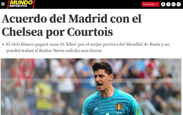 Los mismos medios de comunicación aseguraron que Courtois, de 26 años de edad,se incorporará a las filas de la escuadra ahora conducida tácticamente por Julen Lopetegui cuando finalicen sus vacaciones.
