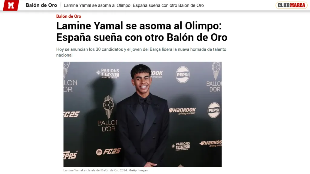 Al respecto, el diario Marca resalta esta chance, subrayando los 18 goles y 22 asistencias en 55 partidos de Lamine, aunque reconoce que Ousmane Dembélé es el otro gran favorito para levantar el galardón, pues fue determinante para que el PSG arrasara con la temporada europea 2024/2025 al recolectar la Ligue 1, el Trofeo de Campeones de Francia, la Copa de Francia y la Liga de Campeones de Europa.